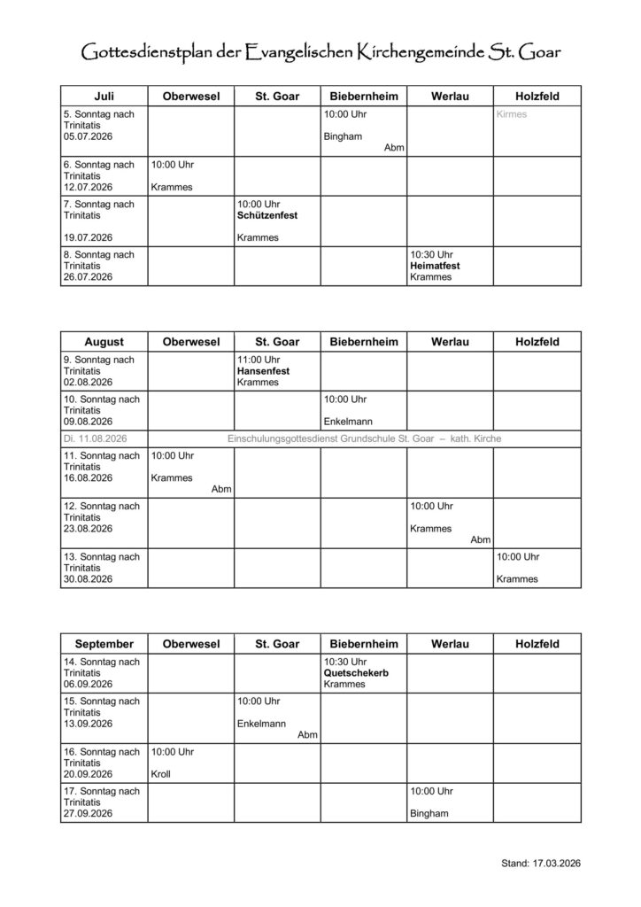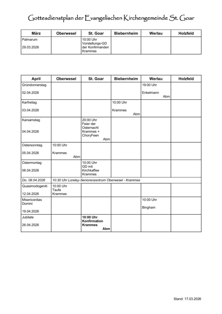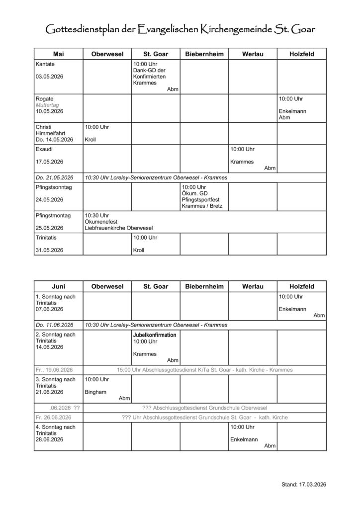 Gottesdienstplan April-September